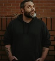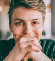 A portrait of a person with an overlay effect, making the person's face appear duplicated and creating a blurry, dreamlike appearance. The background and the edges of the image have an abstract, textured effect in orange, contrasting with the darker tones within the portrait.
